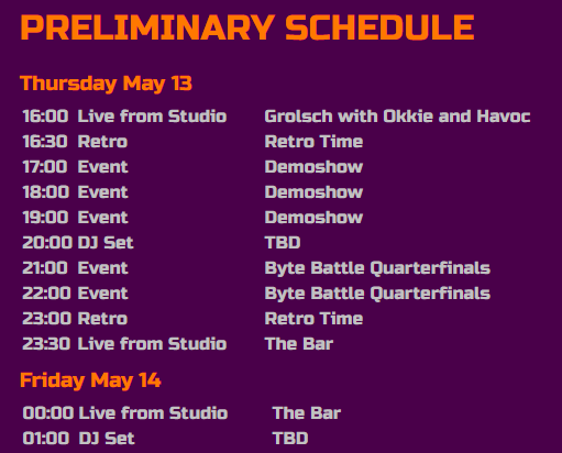 . We will add more details in the upcoming days to this schedule, like the names of DJ's, which DJ sets will have Shader Jam visual support, and which demoshow will be shown when